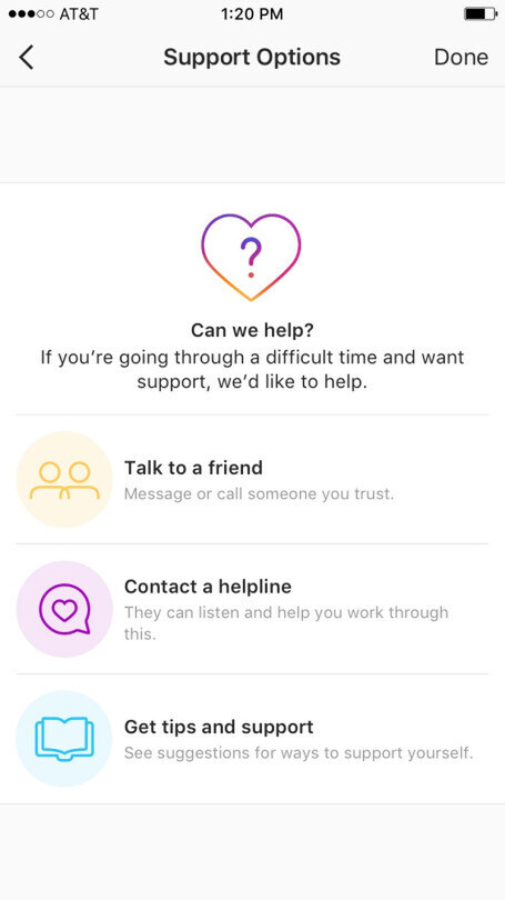 “If you believe that someone you care about may be thinking about injuring themselves, you can report it anonymously, and we will connect your friend to organizations that offer help. We have teams working 24 hours a day, seven days a week, around the world to review these reports.”