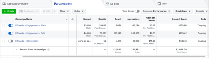 The ability to split test messaging and creative to see what’s resonating with your audience for a low cost is one of Facebook’s greatest features. As most marketers have figured out by now, A/B testing is a powerful tool (if you haven’t started doing this, now is the time). And Business Manager has seemingly endless segmentation options that make testing multiple content approaches a breeze without overspending. Per Jonathan, “I can spend $10K on Facebook and change the headline and hook multiple times, versus spending $10K on a magazine ad and hoping it's going to work.” The latter is what I call gambling.