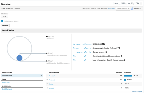 Here you can see all your Social Network Data in one place. It will list all your networks, the visits (sessions) from these networks, and any conversions that happened during that month.