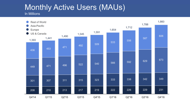 As reported by TechCrunch, Facebook had another strong quarter in Q4 2016, earning $8.81 billion in revenue. This represents a 53% jump from the same time last year.