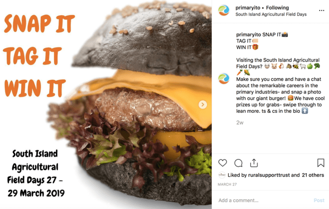 You can’t just have it sit there, so we decided that the purpose of field days for us is to raise awareness of careers in the primary industries and how Primary ITO can help build capability for the industry. We set up a simple social media-based campaign to encourage people to take a photo with the burger and share it to social media – snap it tag it win it – hashtagging #knowledgetogrow which is Primary ITO’s tagline, and tagging us in.